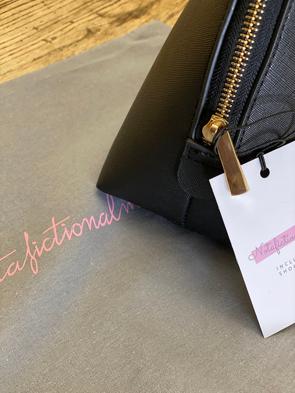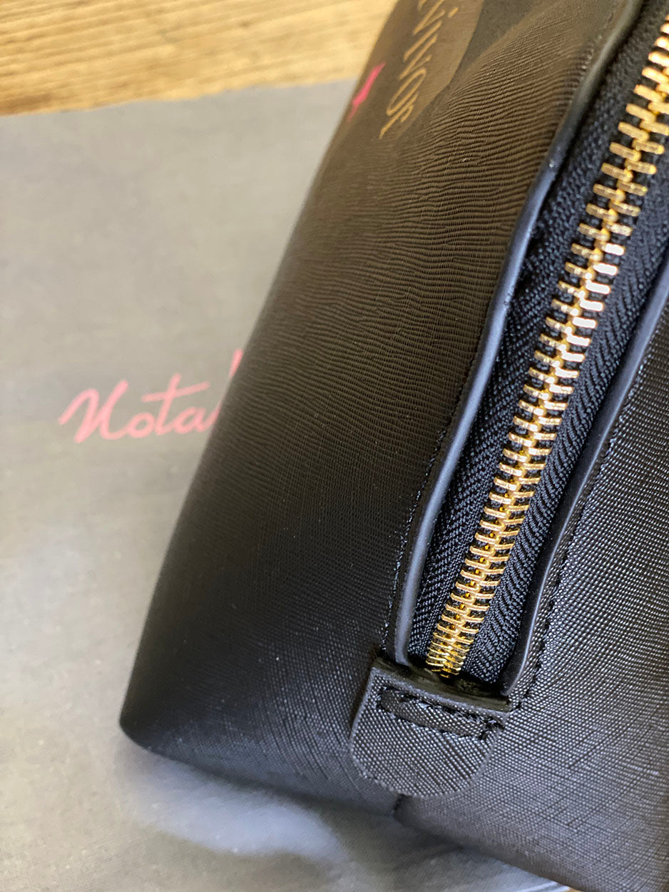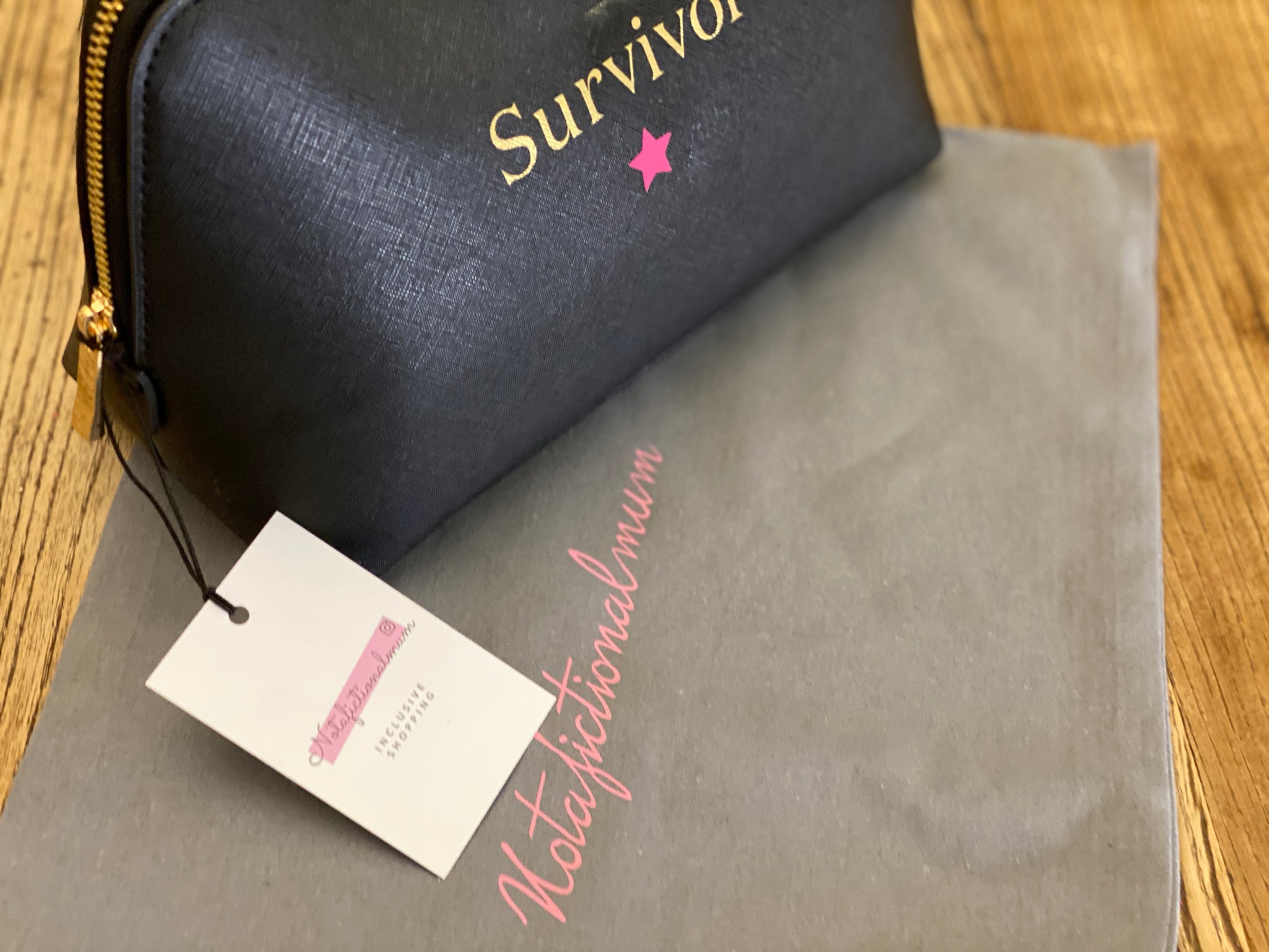 You are stronger than you know. NFM's Survivor washbag is handstamped in gold, bright pink star underneath on a black leather effect bag with gold zip detail. NFM detail on the reverse in gold. Grey protective notafictionalmum dust bag included.