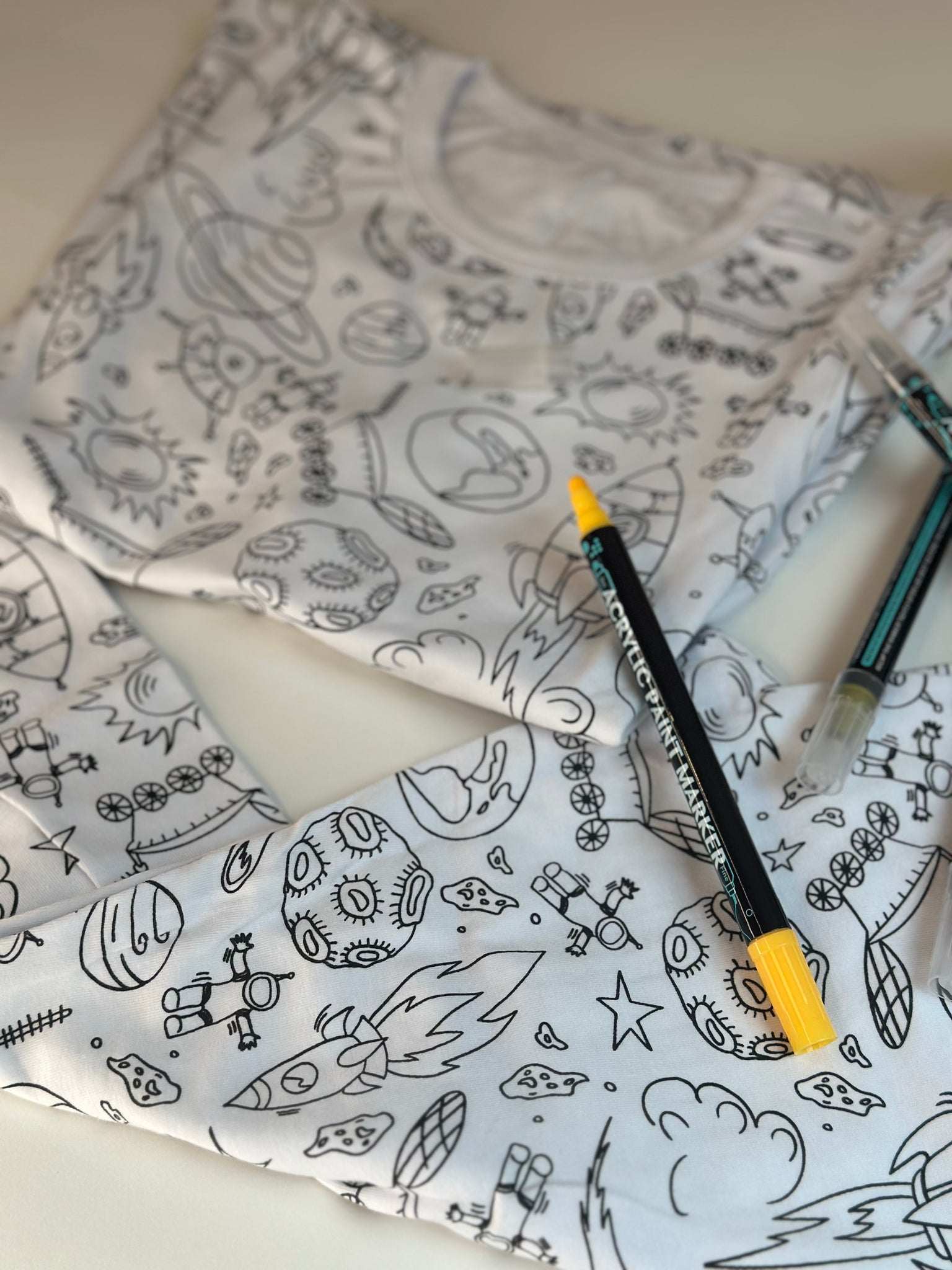 Create your very own custom PJs with these adorable soft cotton sets designed to be coloured in ! Available in 3 different designs for both boys and girls. Complete with a set of fabric pens to get creative.
