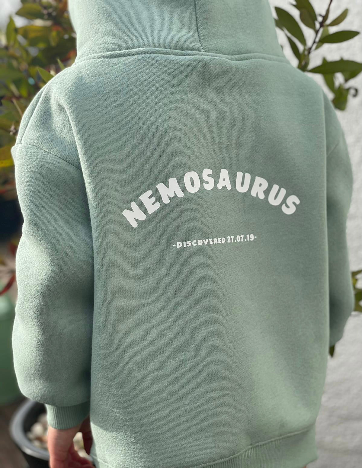 Snuggly soft sage green dino discovered hoodie with stegosaurus plates on the hood. Handstamped and personalised with child's name followed by 'saurus' and the date they were discovered underneath.