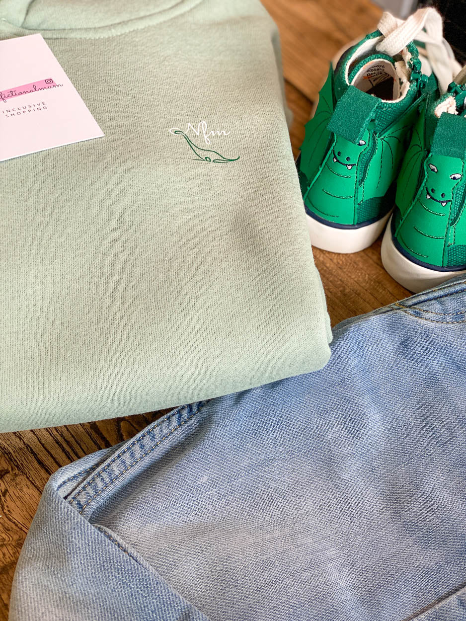 green-kids-hoodie-dino-nfm-logo-next-to-green-kids-dino-trainers-from-the-adoption-gift-range-by-notafictionalmum