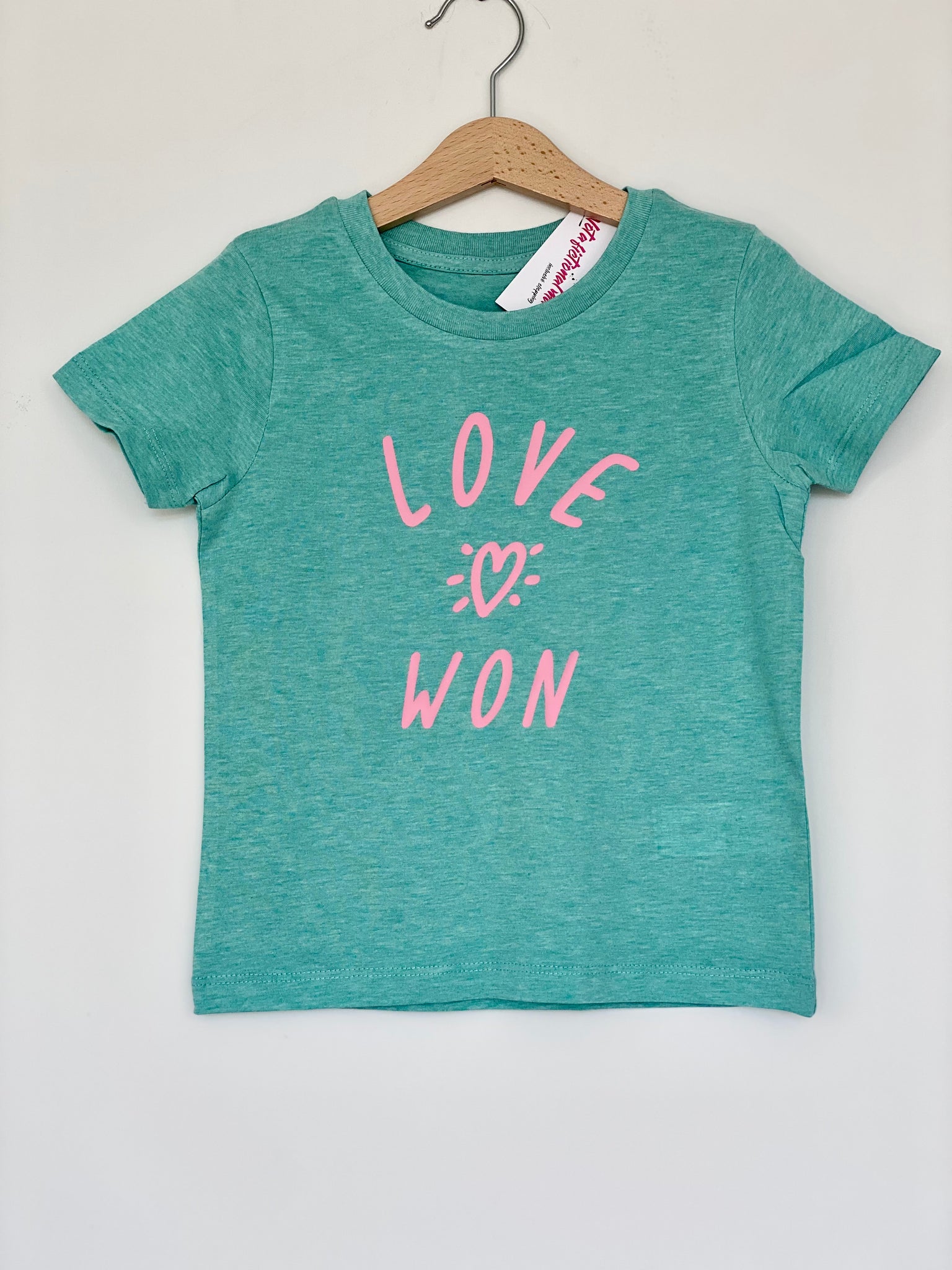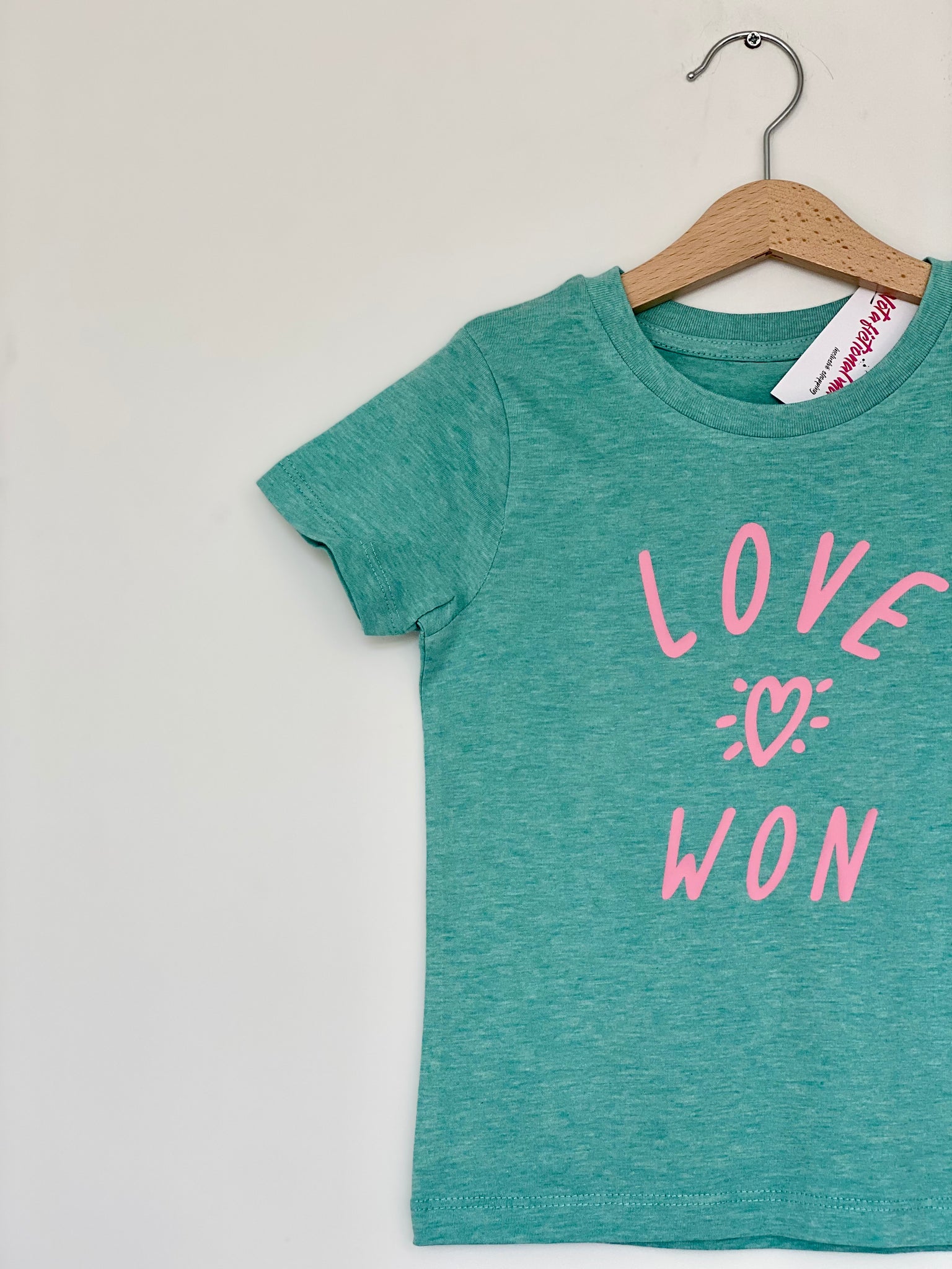 'Love Won' handstamped t-shirt in baby on on a beautifully soft mint green tee made from 100% organic cotton. Available in matching grown up sizes too!