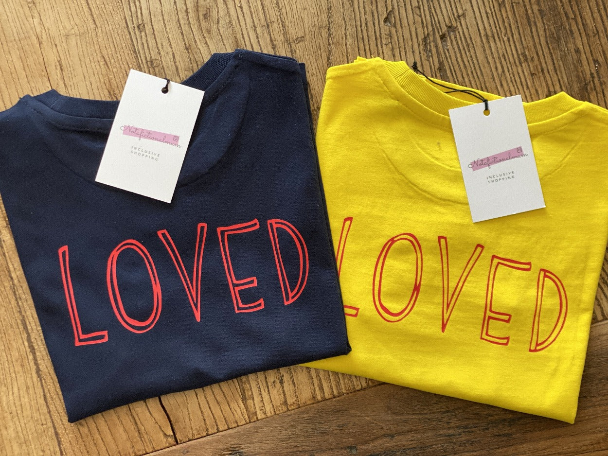 • Load image into Gallery viewer, Loved-tshirts-navy-and-yellow-flatlays