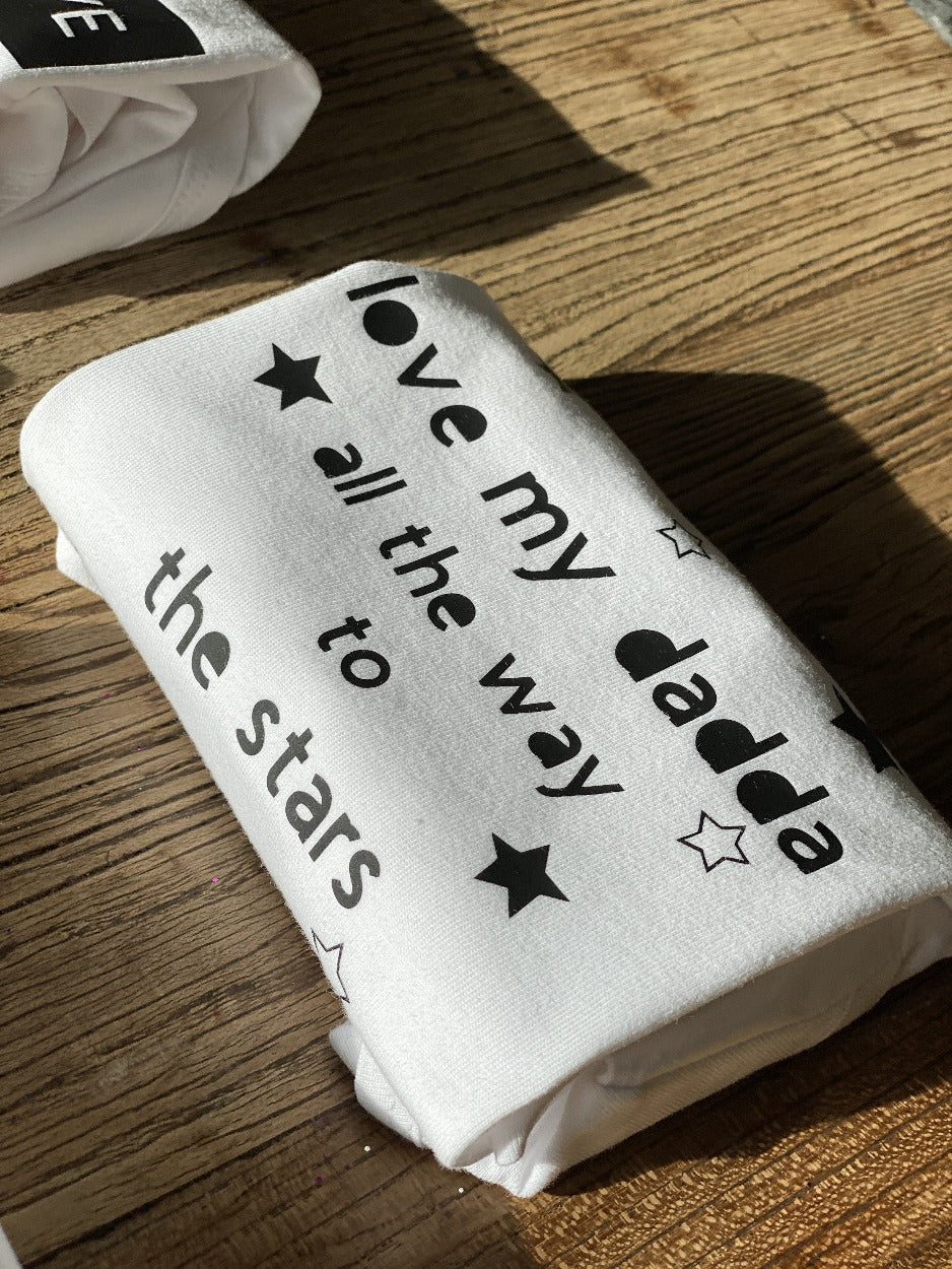 Beautiful adoption baby gifts to all our LGBTQ+ families. This gorgeous same-sex babygrow set comprises four 100% organic cotton, individually designed vests for two mummies or daddies. Personalisation options for stars and moon vest also so both Daddy and Dada, Mummy and Muma can feel recognised.