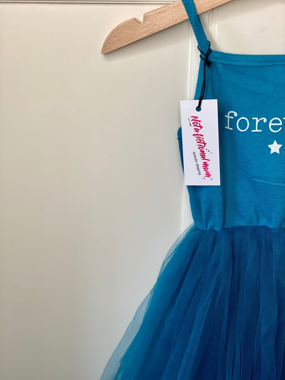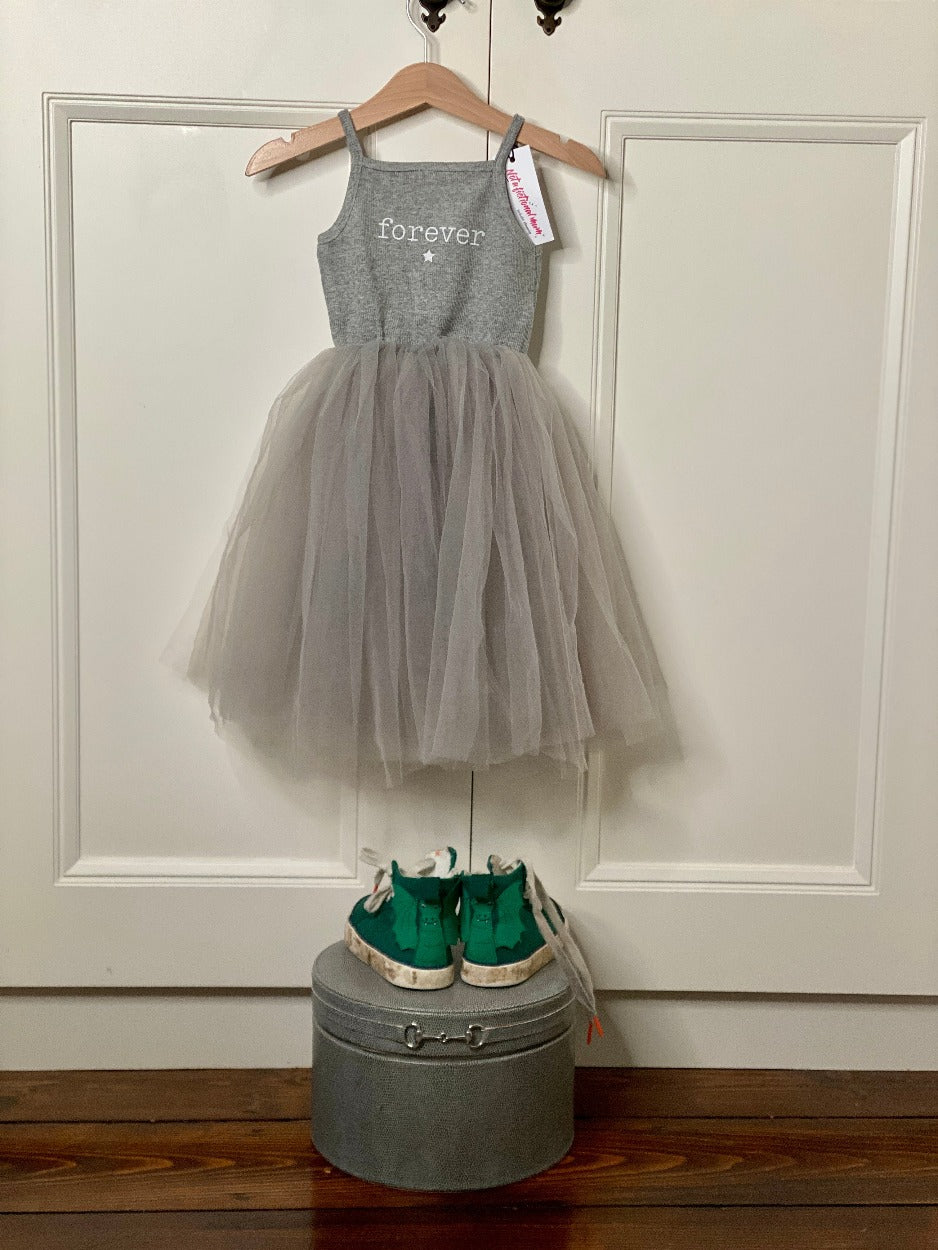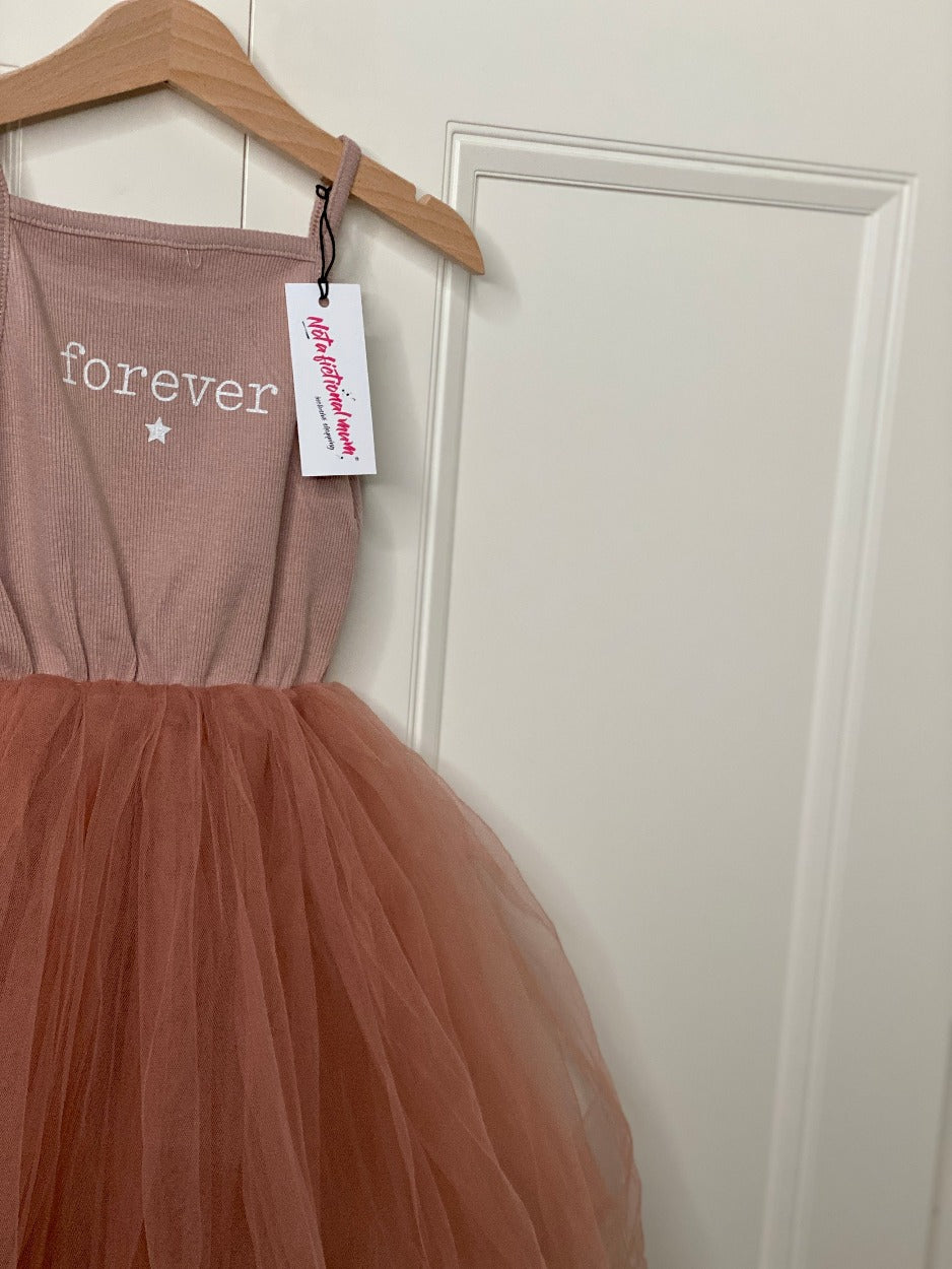 The stunning tulle skirt, forever fairy dress is the ultimate celebration dress. Choose from Dusky pink or vintage grey White sparkle forever and star hand stamped design on the reverse.