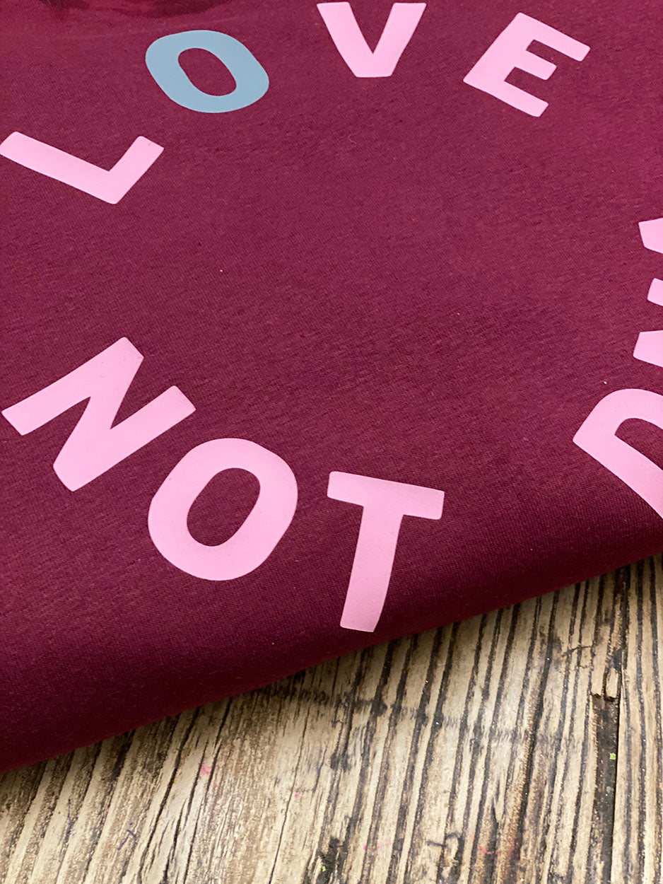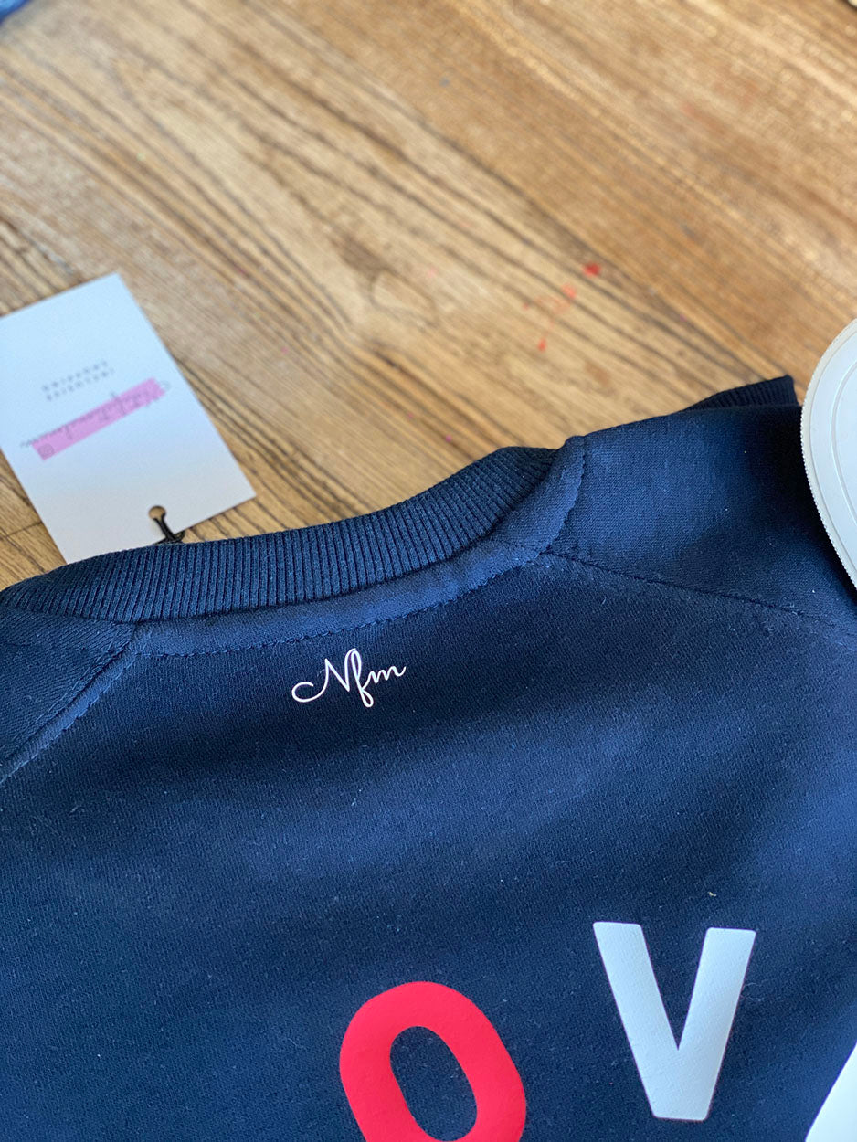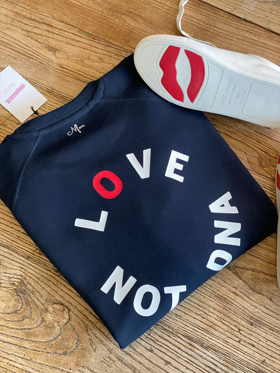 This super-cosy adult's sweat is handstamped with 'LOVE NOT DNA' on the reverse with the 'o' in red. NFM branding on the reverse neckline.