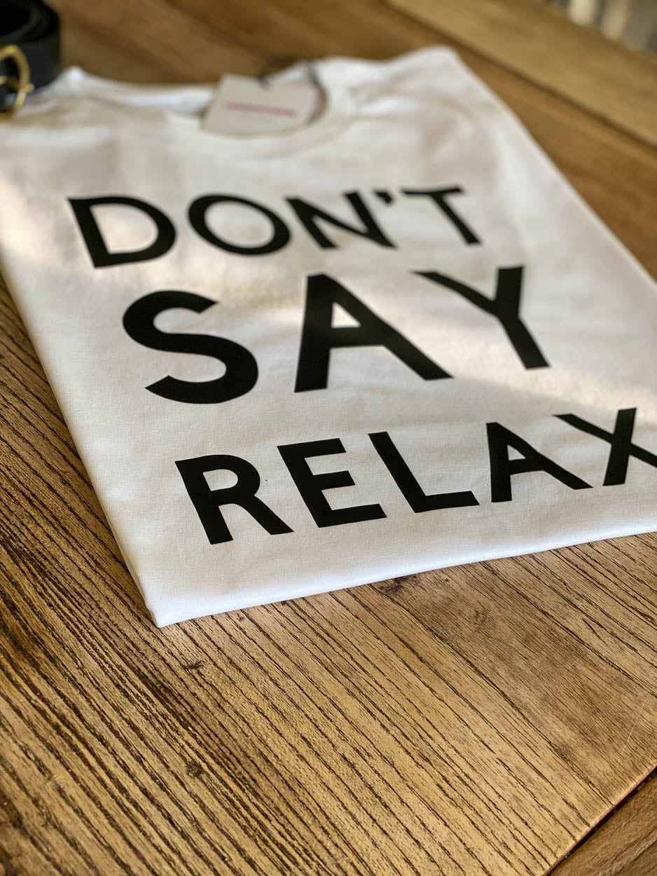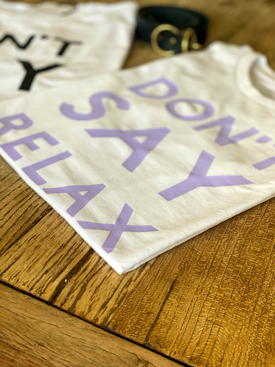 The DON'T SAY RELAX t-shirt by Notafictionalmum, handstamped on a white Tee in black or lilac. Inclusive clothing that makes a statement: