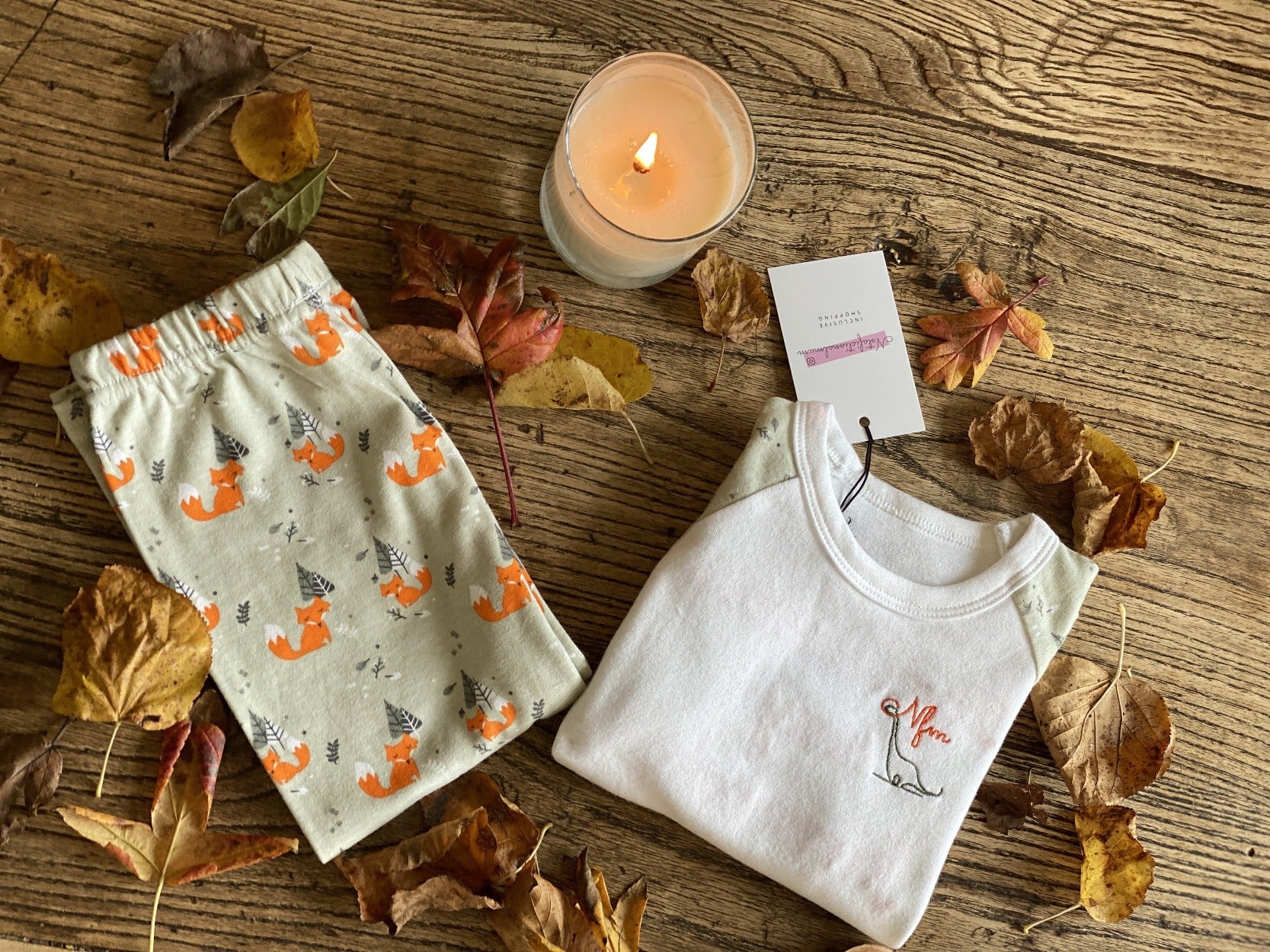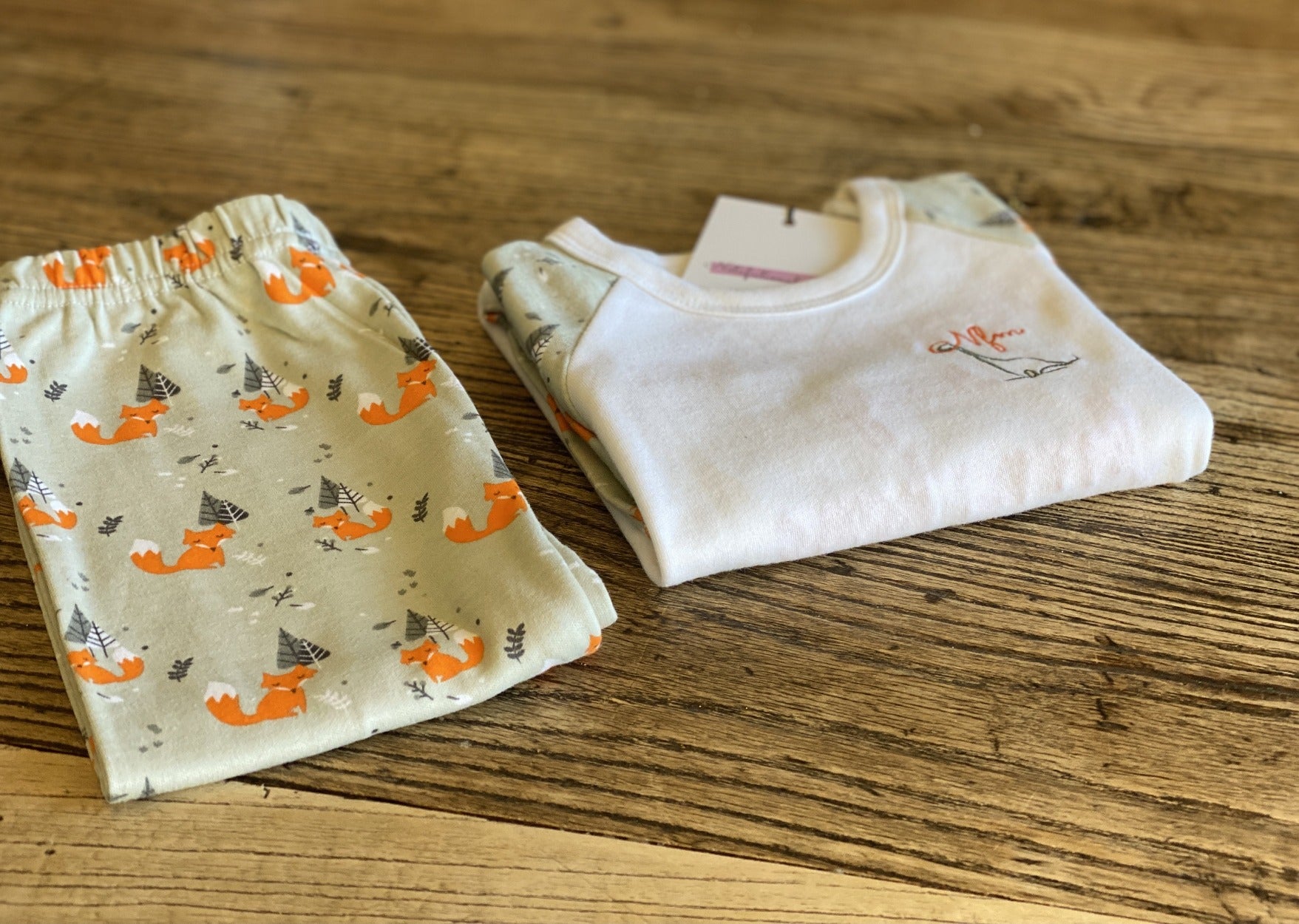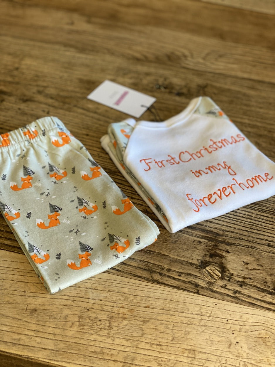 Beautifully soft and cosy foxy PJ set, NFM branding on the front, embroidered in orange with 'first Christmas in my forever home on the reverse, because the first Christmas in a forever home is one not to be forgotten.