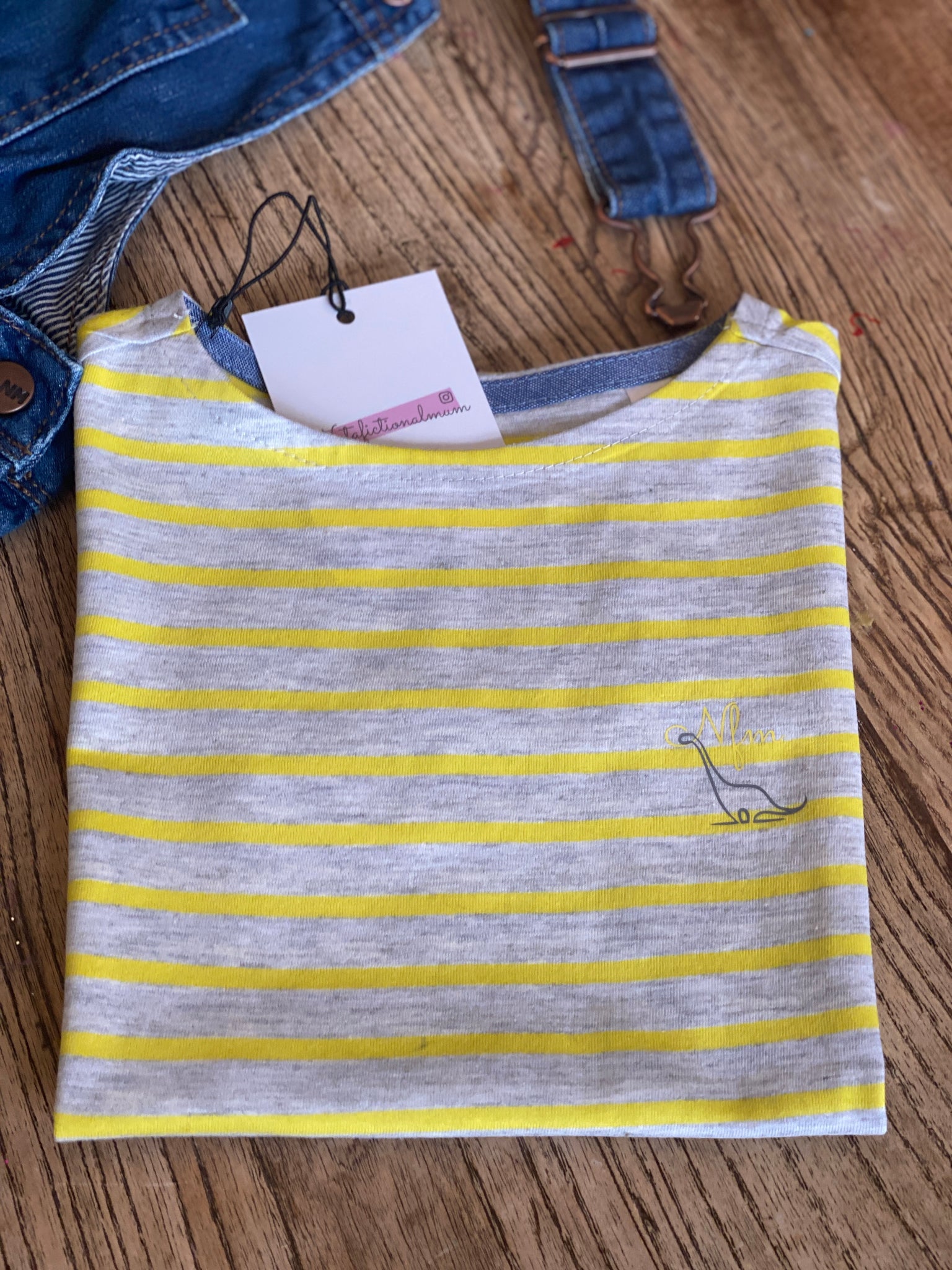 Ridiculously cute grey and yellow stripped tee with grey bunny ears and 'some bunny to love' stamped on the back in white and yellow. NFM branding on the front.
