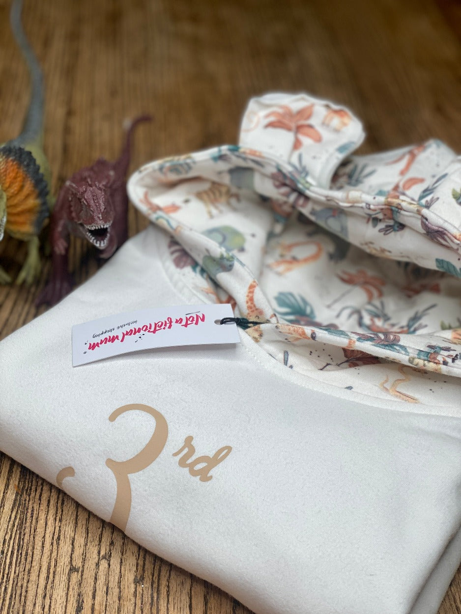 These Safari familyversay bear ear hoodies are super warm and snuggly. Featuring a long-sleeved watercolour print design on the reverse and hood also. The PJ's are personalised in beige and safari green with your familyversary year. Please add year personalisation request in notes upon checkout