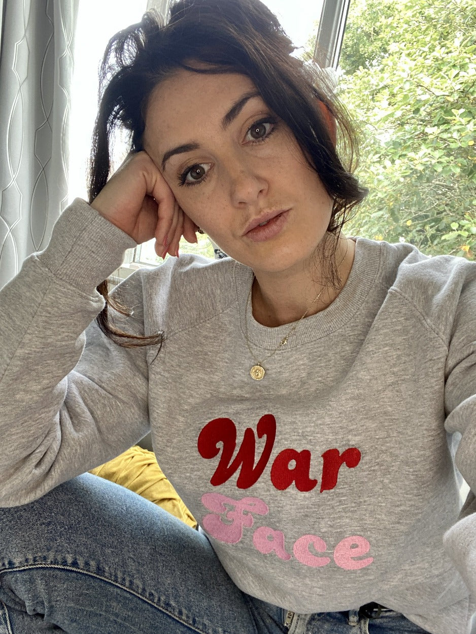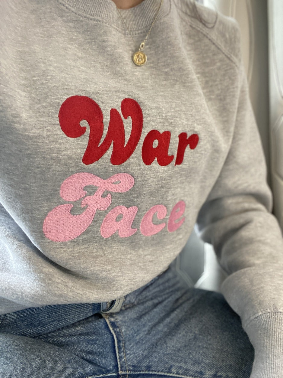 Grey unisex-style sweat embroidered with war face on the front in contrasting red and pink cotton. NFM branding on the reverse neckline also.